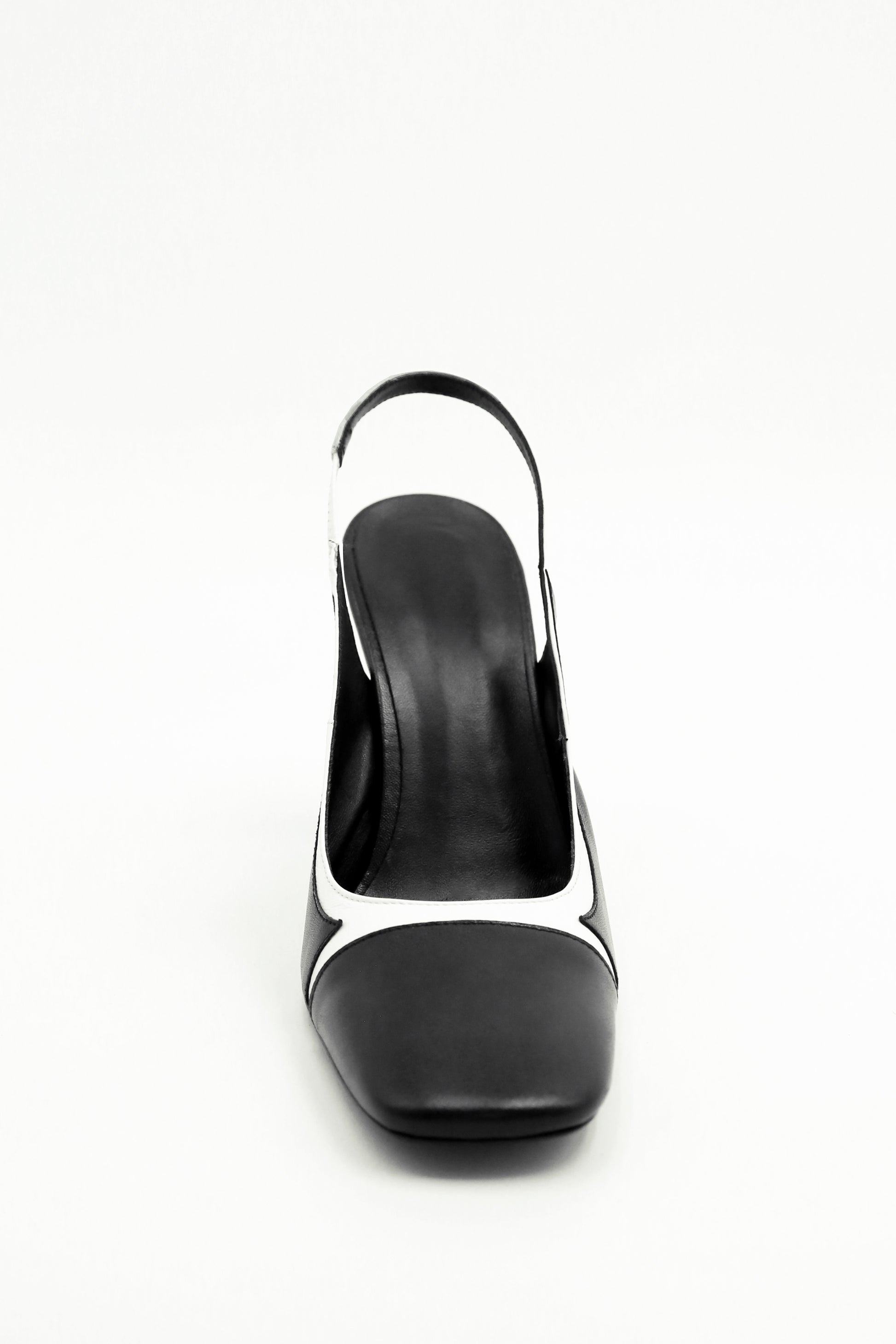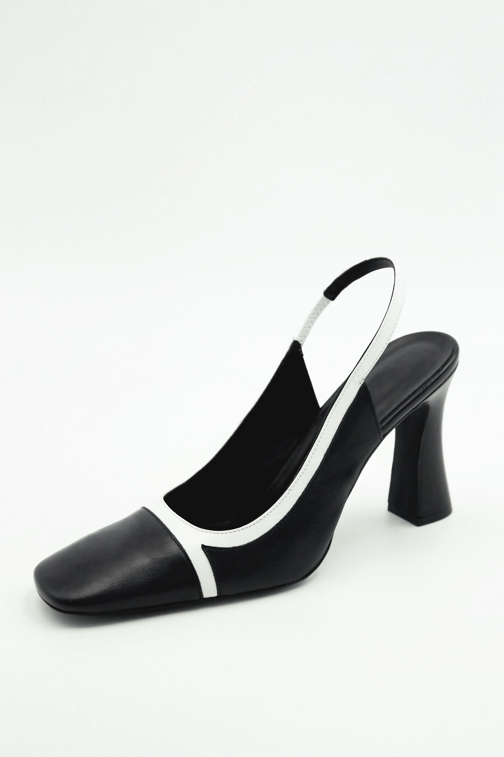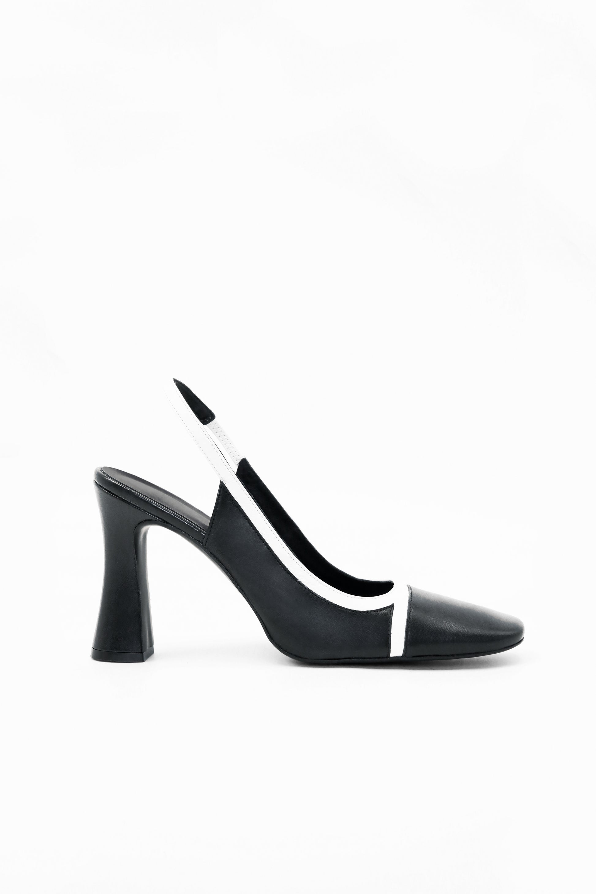 Mallo approaches simplicity through the two-tone selection of high-quality smooth leathers in black and white. The white line runs the length of the structure. The slingback strap takes its inspiration from vintage and art deco aesthetics, while the slightly flared heel subtly accompanies the curved lines of the Mallo model.